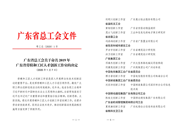 1.廣東省總工會(huì)關(guān)于命名 2019 年廣東省勞模和工匠人才創(chuàng)新工作室的決定(粵工總〔2020〕1號(hào))
