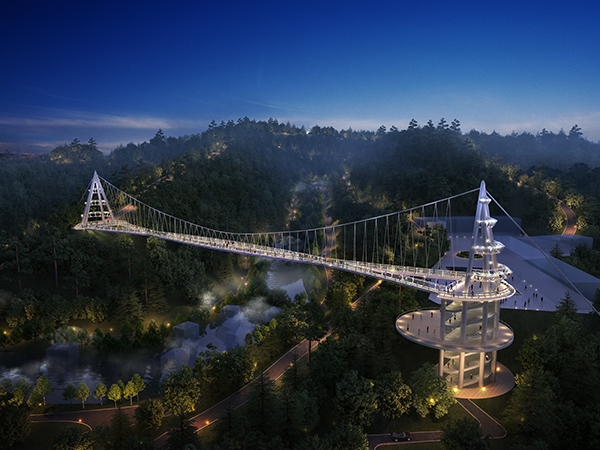 定位為“全國第一條單索玻璃橋”“全國第一條曲線雙橋面玻璃橋”的梅州南壽峰健康產(chǎn)業(yè)園景觀人行天橋項(xiàng)目,由中國鋼結(jié)構(gòu)大師、廣東省工程勘察設(shè)計(jì)大師、公司顧問結(jié)構(gòu)總工程師陳星領(lǐng)銜設(shè)計(jì)。方案大膽采用橋面體系為雙主纜+X形雙拱雙橋面系,橋面采用變截面、變厚度箱型鋼梁;玻璃橋主跨180米,索塔頂之間距離188米,單側(cè)橋面寬度2.9米。該項(xiàng)目于2018年開始設(shè)計(jì),2019年完工,2021年2月竣工驗(yàn)收并投入使用,是廣東首例資質(zhì)齊全、手續(xù)完備的新業(yè)態(tài)旅游項(xiàng)目。